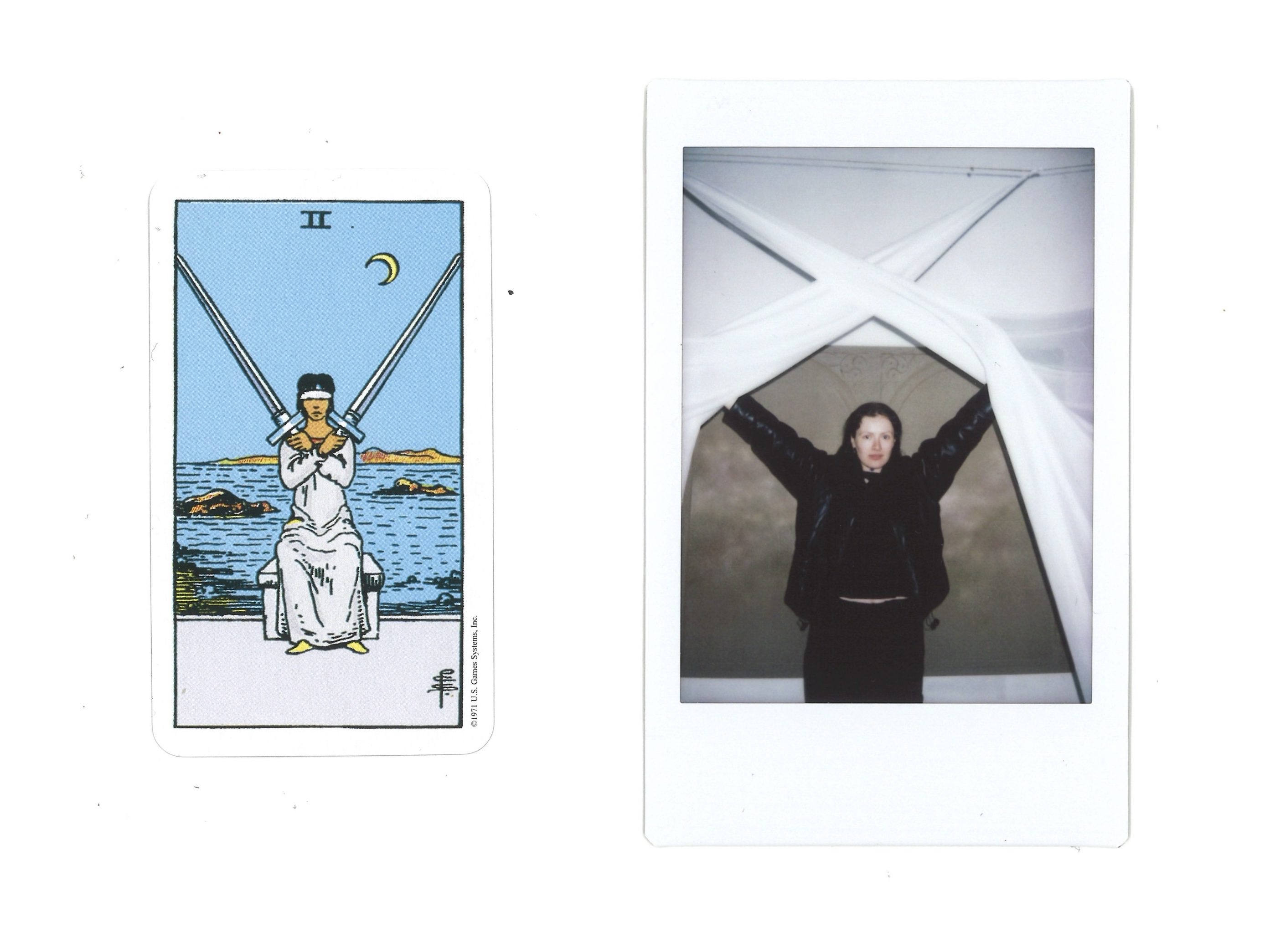 7. The visual elements of the painting are subconsciously drawn from fragments in her studio, including: a reproduction of Jan Van Eyck’s Ghent Altarpiece, the (rare) pristine blue of Berlin sky, and the Waite Rider tarot card, Two of Swords.